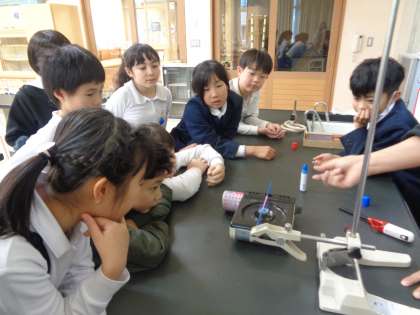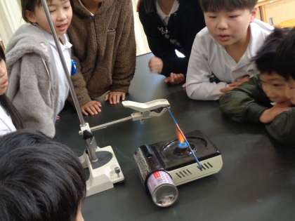 理科では、物のあたたまりかたの実験をしました。あたたまりかたが目で見え、子供たちは学びを深めていました。
