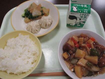 今日の献立は、ごはん、牛乳、えび包子、大根のナムル、酢豚です。中華料理の献立です。