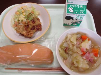 暖かな小春日和の日になりました。今日の献立は、コッペパン、牛乳、豚のフリッター、ひよこ豆のサラダ、野菜のスープ煮です。