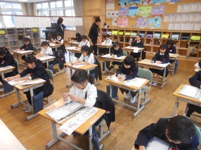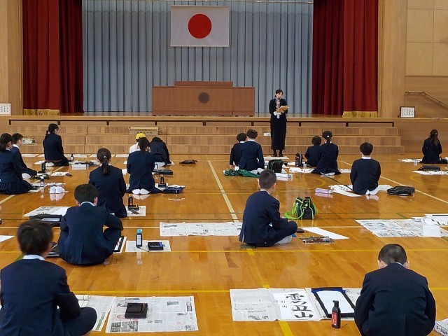 始業式のあとは、3年生以上が体育館で、1・2年生は教室で書き初めを行いました。