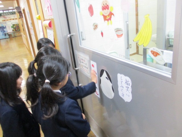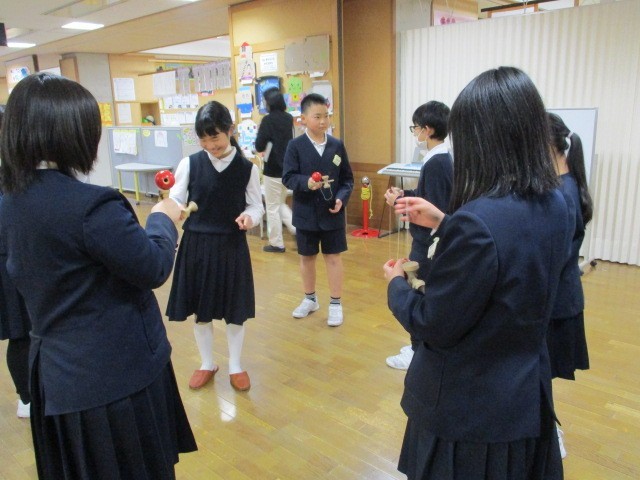 今日は天気が悪かったので、休み時間は室内で自由に遊びました。福笑いやけん玉に挑戦している子供たちがいて、とても楽しそうでした。福笑いは調理員さんの手作りです。