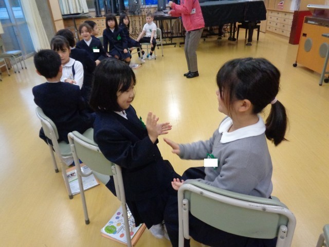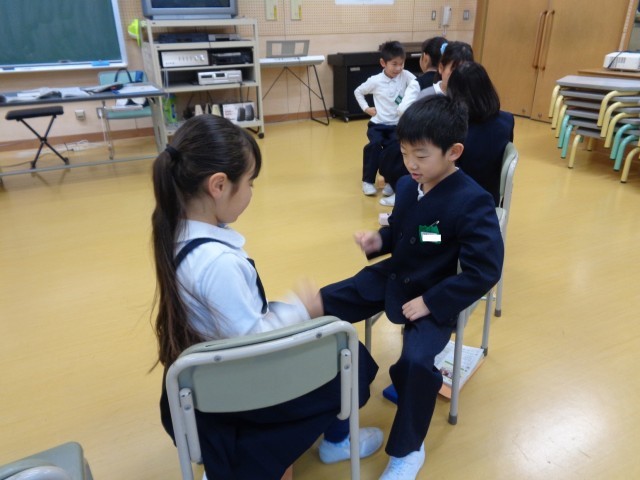 音楽科の時間に「おちゃらか」をしました。リズムに乗って友達とのじゃんけんを楽しみました。