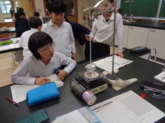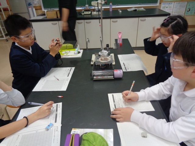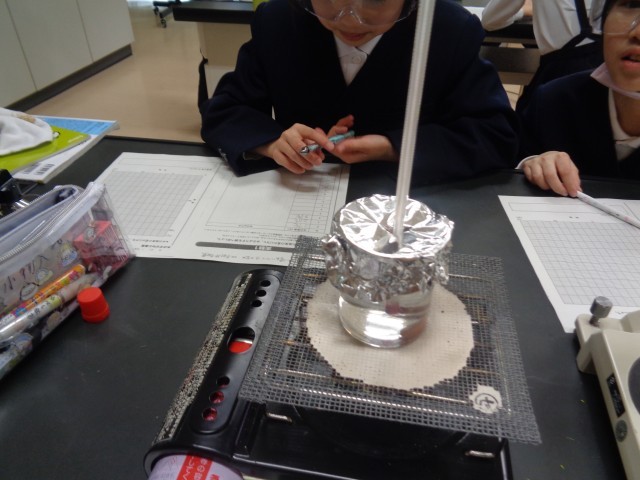 理科では、水を熱したときの温度の変わり方と水のようすについて調べるために実験をしました。