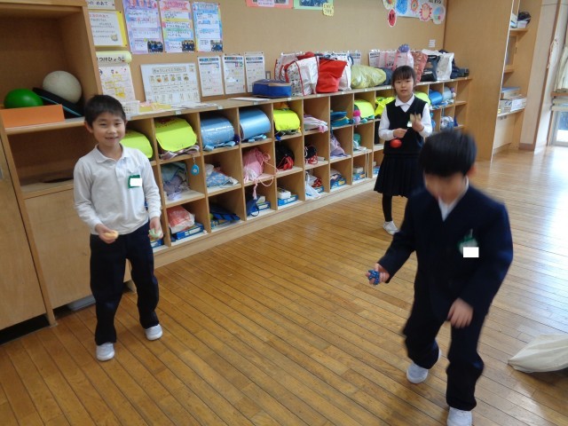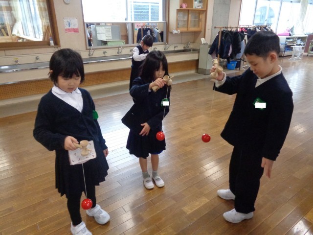 来週行う予定の年長児との交流会で、けん玉やお手玉、あやとりを一緒に楽しむ予定です。