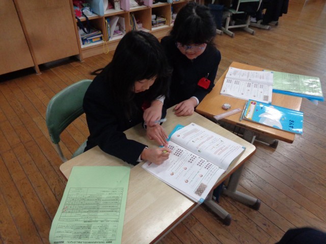 算数の時間には、自分のペースで学習を進めました。友達と協力して問題を解いています。