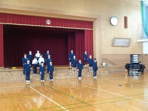 体育館で歌の練習を行いました。音楽室との声の響き方の違いに驚きながらも、精一杯声を出していました。