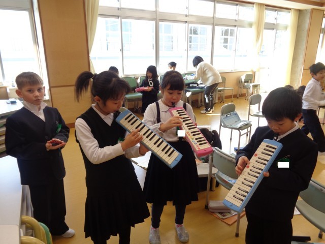 鍵盤ハーモニカ、カスタネット、トライアングル、タンブリン、鉄琴を使って「こいぬのマーチ」を演奏しています。