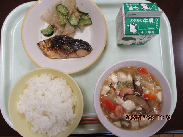 今日の献立は、ごはん、牛乳、ふくらぎの西京焼き、華風和え、えびと豆腐のうま煮です。