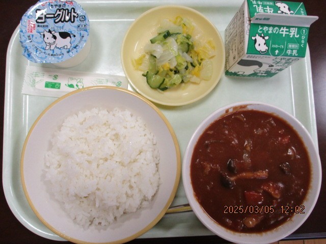 今日の献立は、ごはん、牛乳、食べキリンハヤシ、白菜サラダ、ヨーグルトです。