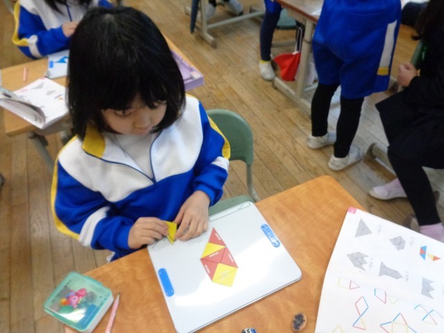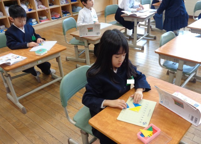 算数科「かたちづくり」の学習で、色板を使ってさまざまな形をつくりました。
