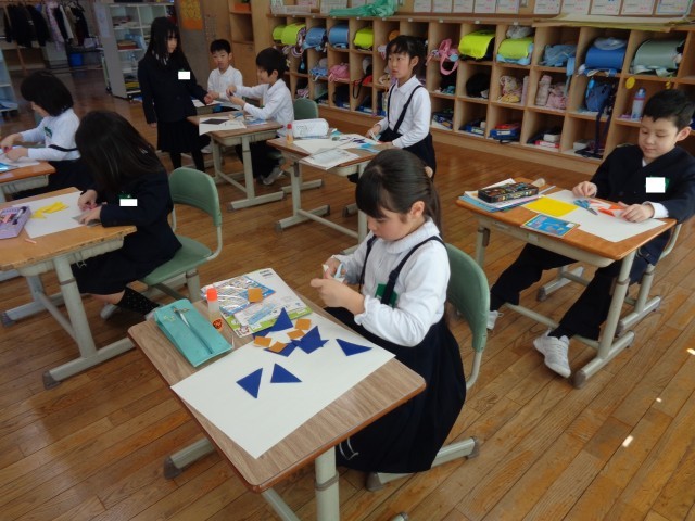 折り紙で四角形や三角形のパーツをたくさんつくり、紙に貼って楽しみました。