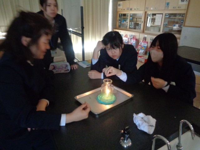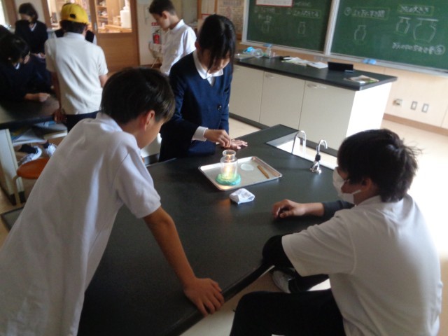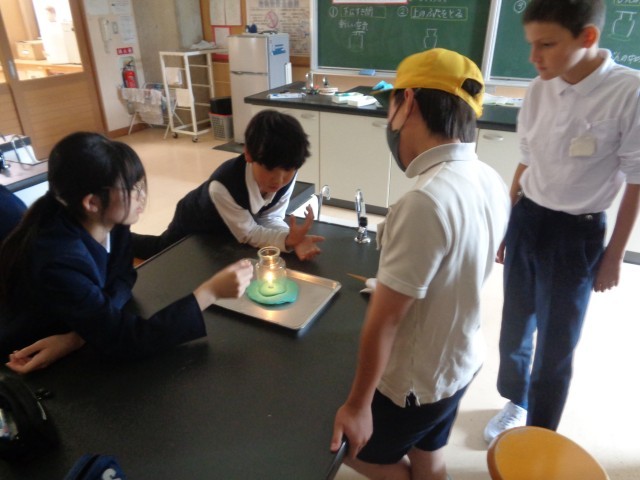 集気びんの中のろうそくの火を燃やし続けるにはどうしたらよいか考えるための実験を行いました。線香の煙を使って空気の流れを可視化し、ろうそくの火が燃え続けるときの空気の流れに注目しました。