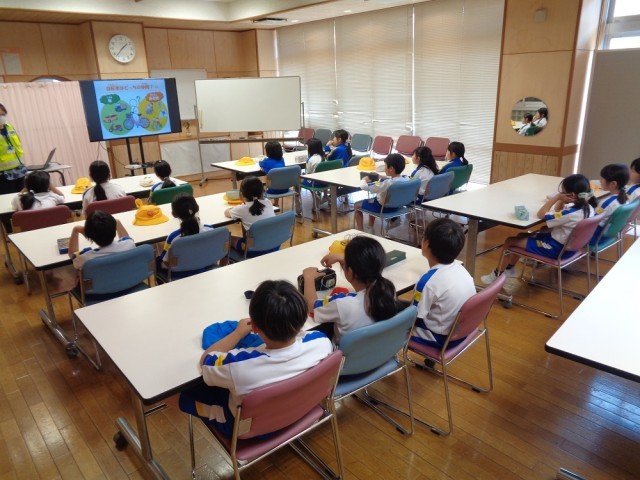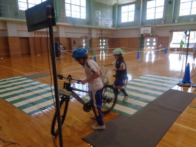 警察署や交通安全協会、地域の方々を招いて、自転車交通安全教室を行いました。話をしっかり聞いて、真剣に活動する子供たちでした。