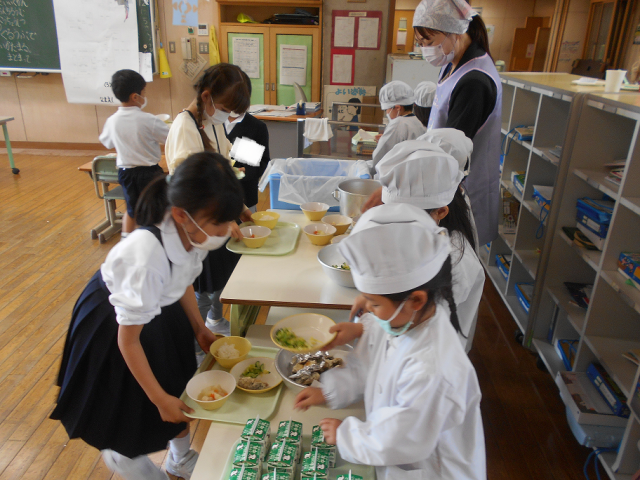 子供たちにとって、給食はとても楽しみな時間です。昼が近づくと「今日は何かな」「おかわり食べたいな」など、うれしそうな声が聞こえてきます。配膳もどんどん上手になっています。