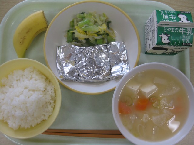 今日の献立は、ご飯 牛乳 さばの銀紙焼き おひたし 呉汁 バナナ です。
