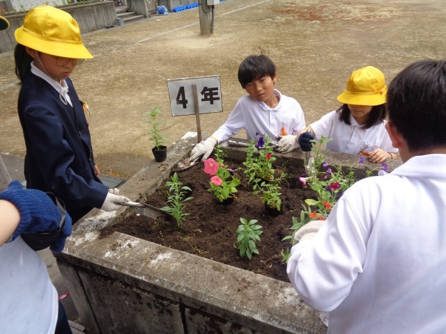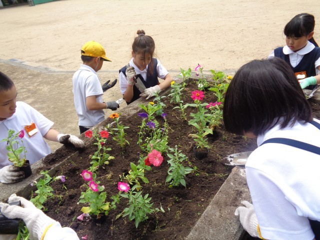 花壇に花を植えました。4年生の花壇がにぎやかになりました。