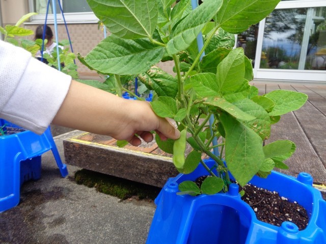 葉っぱの数が増え、つぼみができたり花が咲いたりしています。枝豆やピーマン、ミニトマトには小さな実ができました。「昨日よりも大きくなっているよ!」と嬉しそうに話していました。