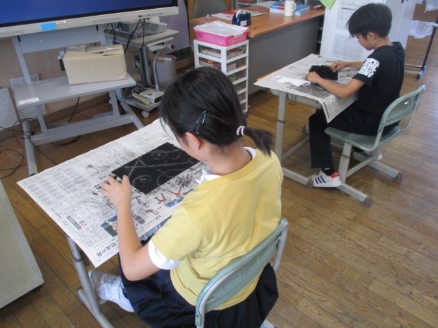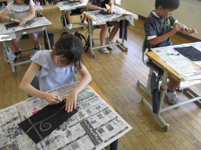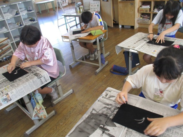 図画工作科の学習では、コンテや消しゴムを使って、「消してかく」作品に取り組みました。
