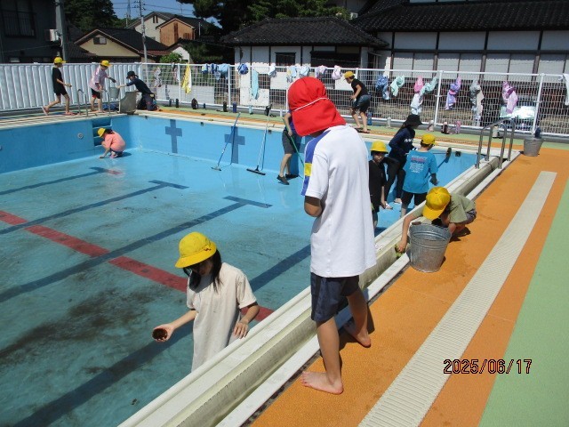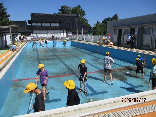 4年生は更衣室やトイレ、5年生はプールの溝、6年生はプールの中と役割分担を行い、短い時間で手早く掃除を行うことができました。きれいになったプールで水泳学習を行うのが楽しみです。