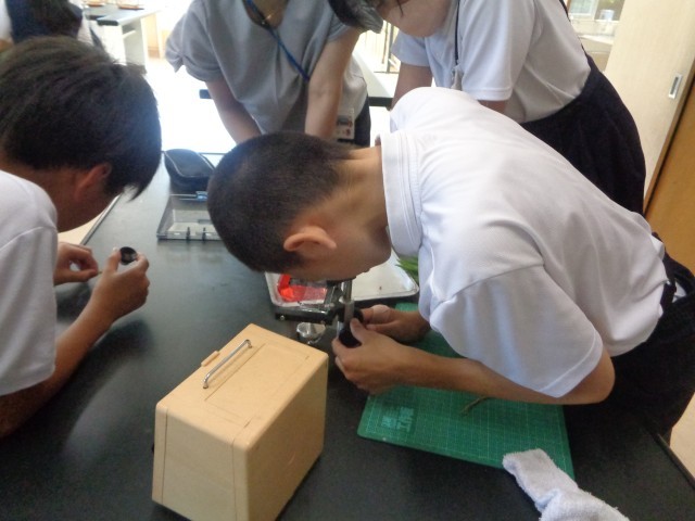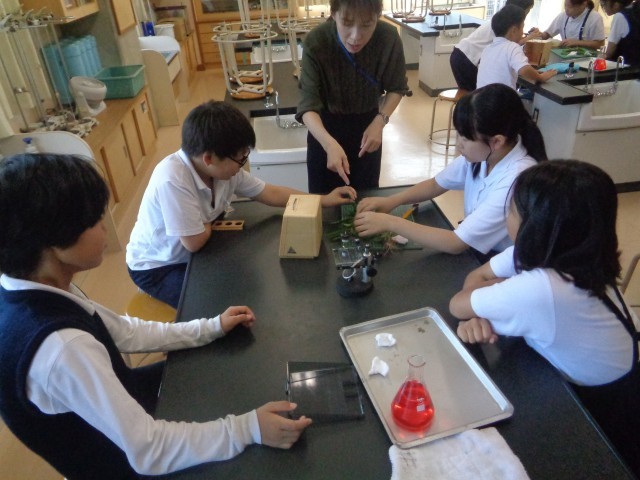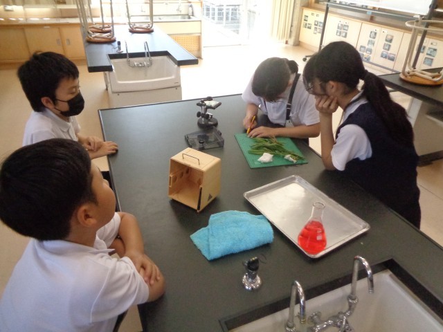 植物が吸い上げた水は、植物の体のどこを通って運ばれているのか確かめる実験を行いました。茎や葉をカッターで切り、解剖顕微鏡を使って観察しました。