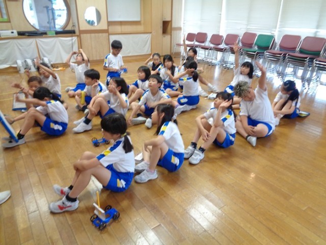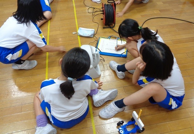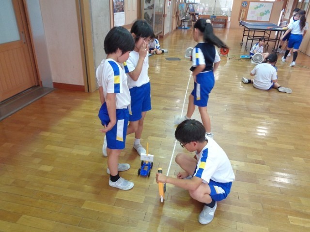 今日の実験では、サーキュレーターを使って強い風を起こし、車を走らせました。人力よりも遠くまで走っていく車が多かったようです。