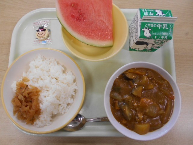 今日の献立は、ごはん 牛乳 夏野菜カレー 福神漬け ポケットチーズ すいか です。