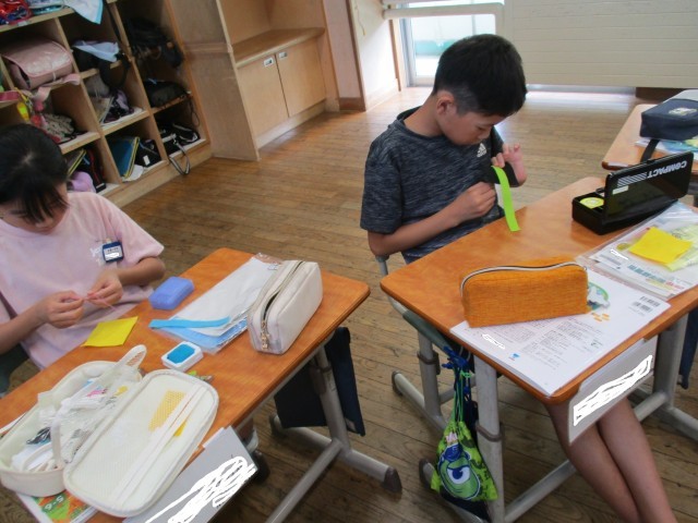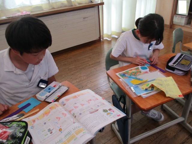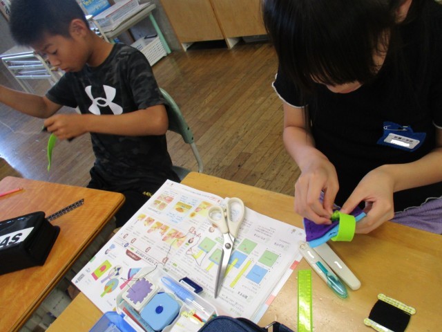 家庭科の学習では、玉結びや玉留め、様々な縫い方等、学習したことを生かして「マイミニバッグ」を作っています。習いたてのソーイングに苦戦しながらも、一つ一つの工程を終わらせる度に満足そうな表情を浮かべています。