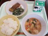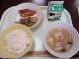 今日の献立は、ご飯、牛乳、赤魚の照り焼き、香味和え、いものこ汁です。里芋がとて...