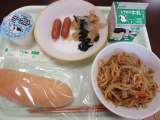 今日の献立は、コッペパン、牛乳、あらびきウインナー、こんにゃくサラダ、焼きそば...