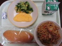 今日の献立は、コッペパン、牛乳、焼きそば、オムレツ、コーンサラダ、ポケットチーズ...