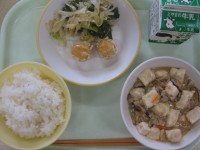 今日の献立は、ごはん 牛乳 にんじんシューマイ わかめのチョナルム マーボー...