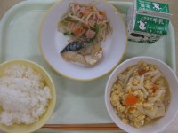 今日の献立は、ごはん 牛乳 さばのみそ煮 野菜ソテー 卵とじ です。