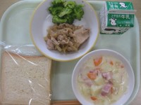 今日の献立は、食パン 牛乳 ポークソテー ゆでブロッコリー クリームシチュー...