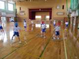 今日の3年生体育では、フラフープを腰や手で回したり、投げて跳んだりくぐったり、...