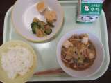 今日の献立は、ごはん、牛乳、韓国風すき焼き、にんじんシューマイ、こんぶ和えです...