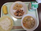 今日の献立は、ごはん、牛乳、あっさりチキン、ごまポテト、つみれ汁、バナナです。