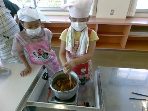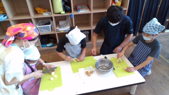 あおぞら級となかよし級では、自分たちで育てた野菜を収穫し、その野菜を使ってカレーづくりをしました。食材を切ったり鍋で煮込んだりするなど、楽しみながらカレーをつくり、最後はおいしく食べることができました。