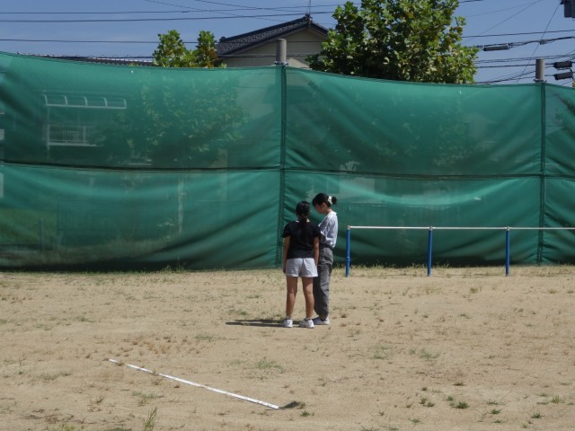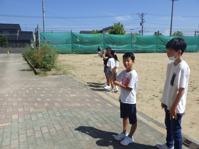 算数では、拡大図や縮図の学習をしています。縮尺を考え、図を書いて、実際の高さを計算しました。グラウンドのネットや校舎のおおよその高さが分かりました。