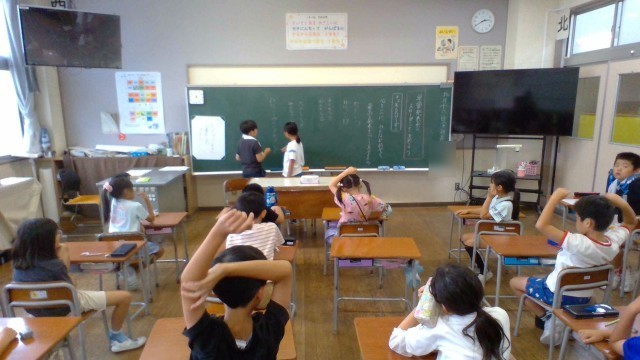 学級会では、学習発表会のスローガンについて話し合いました。入れたいワードを出し合い、自分たちでスローガンを作り上げました。