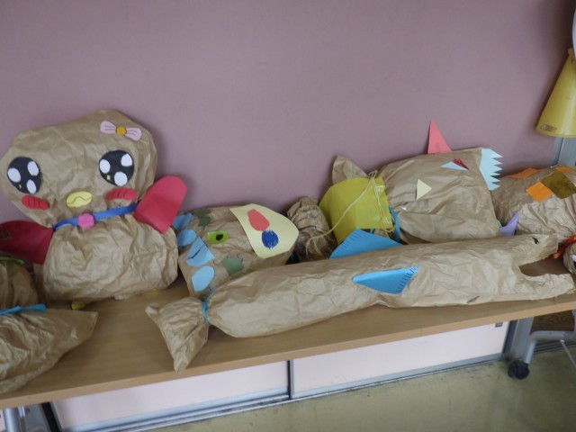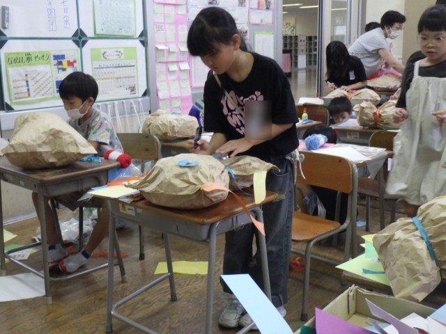 図画工作科「くしゃくしゃぎゅう」の学習に取り組んでいます。リボンや紐を使って袋を縛り、思い思いの作品を作りました。思わずぎゅっとしたくなるかわいい作品ができました。
