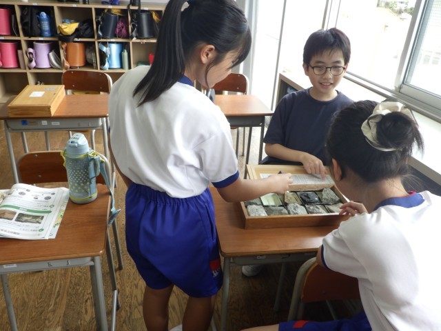 理科では地層のでき方について学習しました。水中に砂や土を流し込む実験を通して地層のでき方を確かめました。また、地層ごとにみられる岩石等の様子を観察しました。ものによって重さや感触が違うことに興味をもって学習しました。