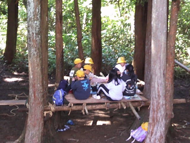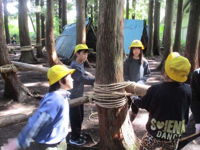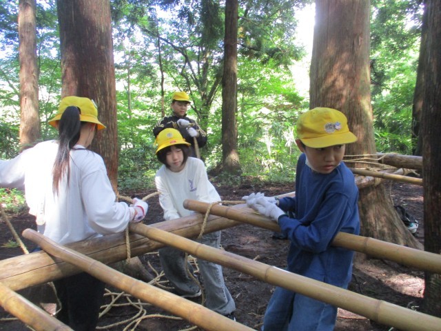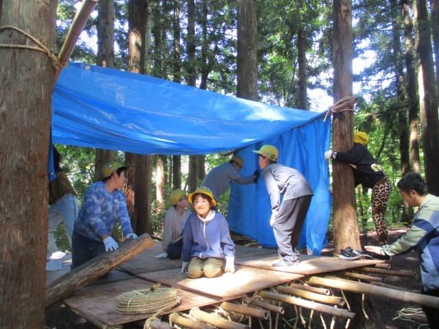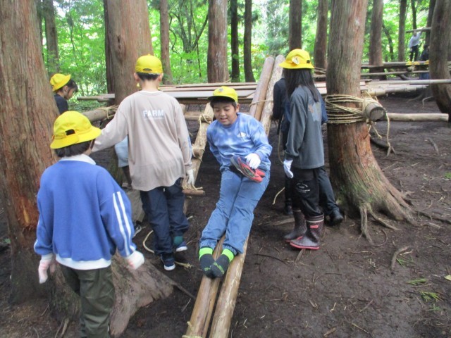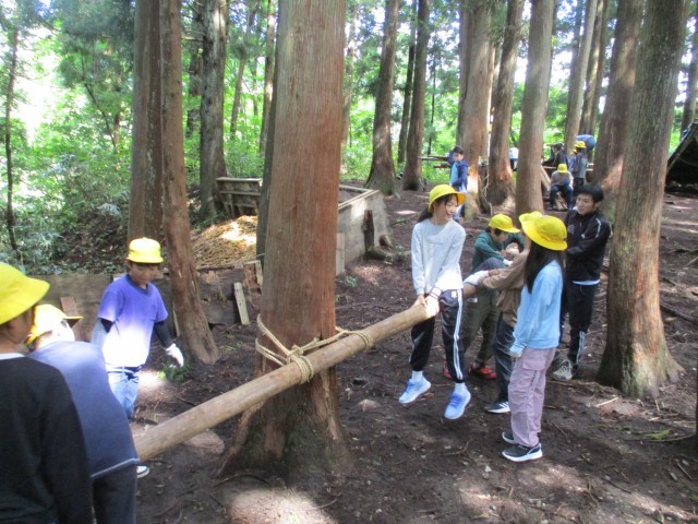 集団宿泊学習2日目は森の小屋づくり、森の遊び場づくりをしました。班のみんなと意見を出し合いながら協力し、理想の小屋をつくっていました。