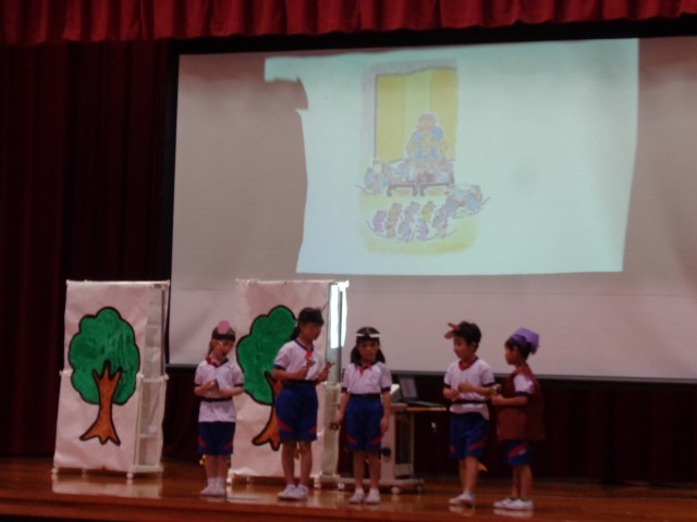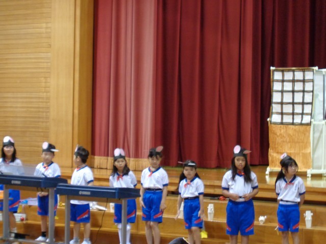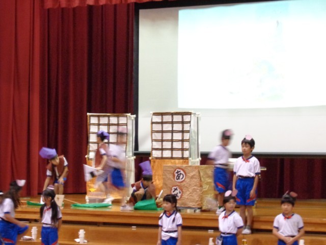 1年生は、「おむすびころりん」の音楽劇をしました。1年生の子供たちにとって、小学校生活で初めての学習発表会でした。この日のために毎日一生懸命練習してきました。今日は、たくさんのお客さんの前で堂々と発表していました。