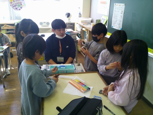図画工作科ではお気に入りの石を見付け、その石から想像を膨らませて色を塗りました。「ひよこに見える」「おにぎりだよ」など、友達と楽しそうに話していました。