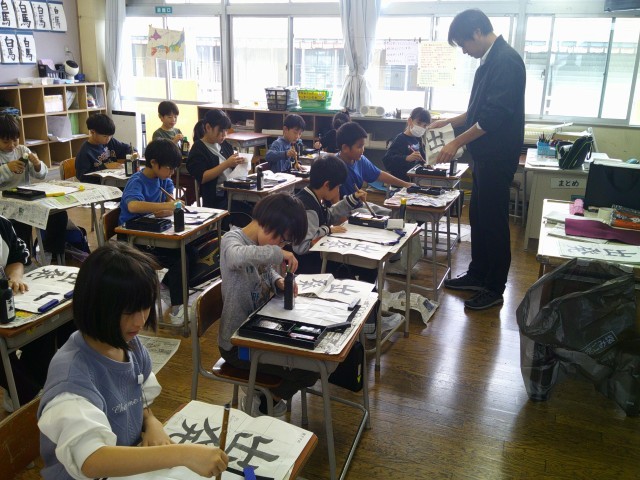 書写では、「出発」という文字を書いています。とめ、はね、はらいを意識しながらバランスよく書いています。