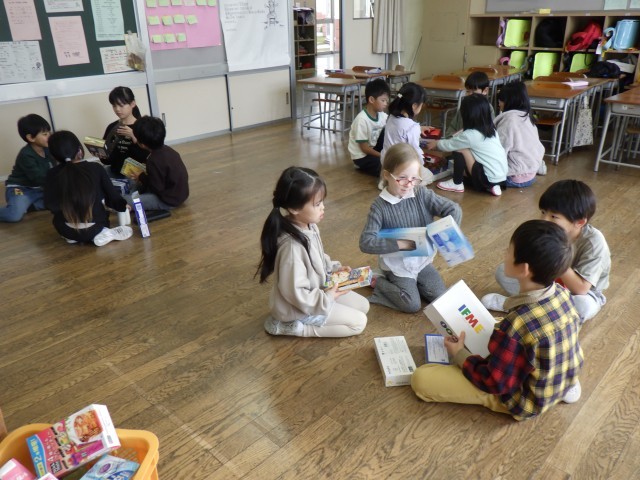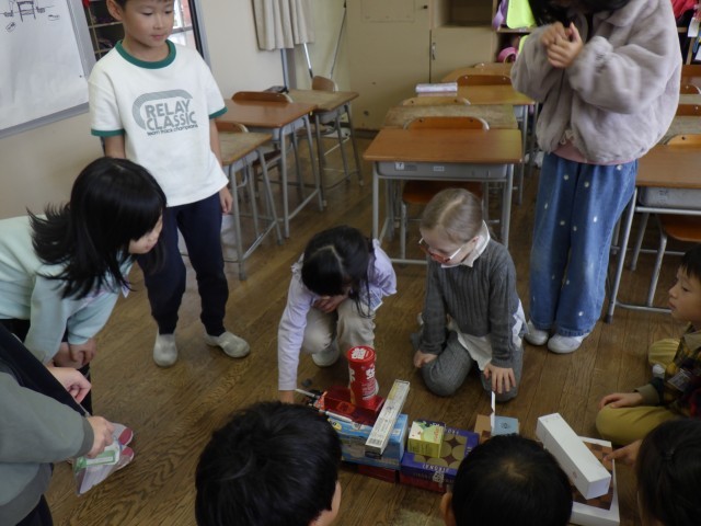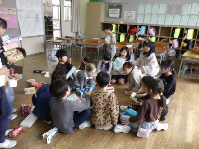 1年生では、算数科「はこのかたち」でどんな形ができるのか試してみました。平らな面と転がる面を上手に使って作っていました。