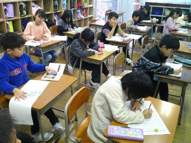 国語科では、お話つくりに挑戦しています。挿絵を参考にしながら想像を膨らませて、文章を書いていました。