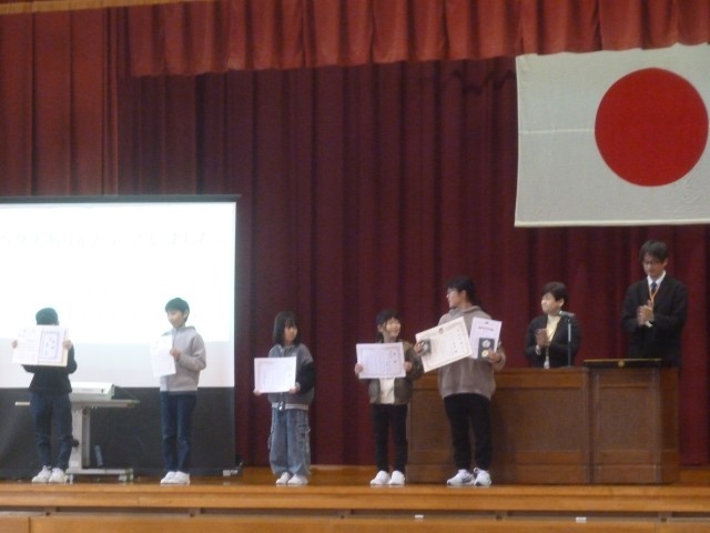 終業式後、2学期にいろいろな大会や作品応募で、頑張った子供たちの表彰式を行いました。