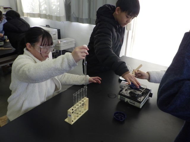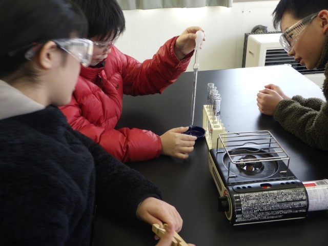 理科では、水溶液について学習しています。5つの水溶液の見た目やにおいを比べたり、蒸発させて残ったものを調べたりしました。アンモニア水や塩酸の水溶液を蒸発させても何も残らなかったことに疑問をもち、これからの学習に向けての課題を見付けていました。