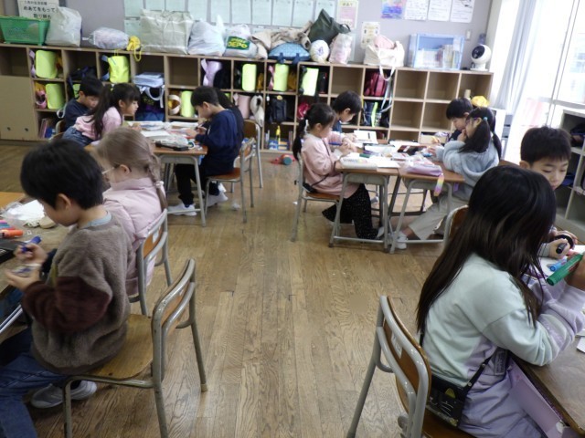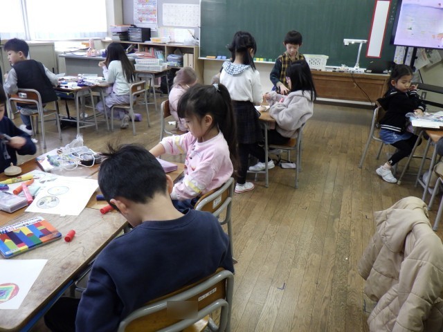 生活科の時間に昔の遊びをします。こまに色を塗りました。それぞれ違う、世界に一つだけのオリジナルのこまになりました。子供たちはこまを回す日を楽しみにしています。
